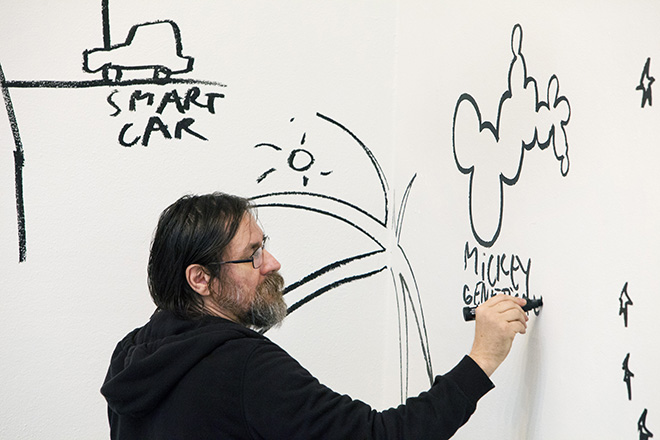 Dan Perjovschi entwickelt seine Zeichnungen live – direkt im Dialog mit dem Publikum. © Pirje Mykkaenen